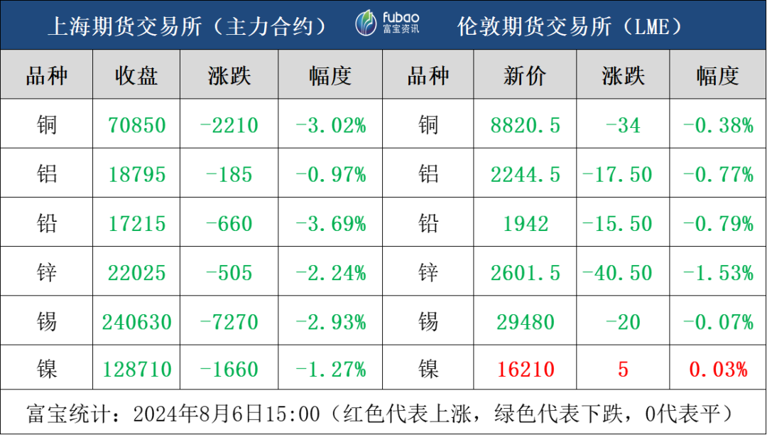 美劳动力市场数据回落,间接引发全球经济衰退预期,宏观利空打压市场风险偏好,有色金属今日全线大跌。截止下午三点收盘,沪铅领跌3.69%;沪铜跌3.02%;沪锡跌2.93%;沪锌跌2.24%;沪镍跌1.27%;沪铝跌0.97%。
